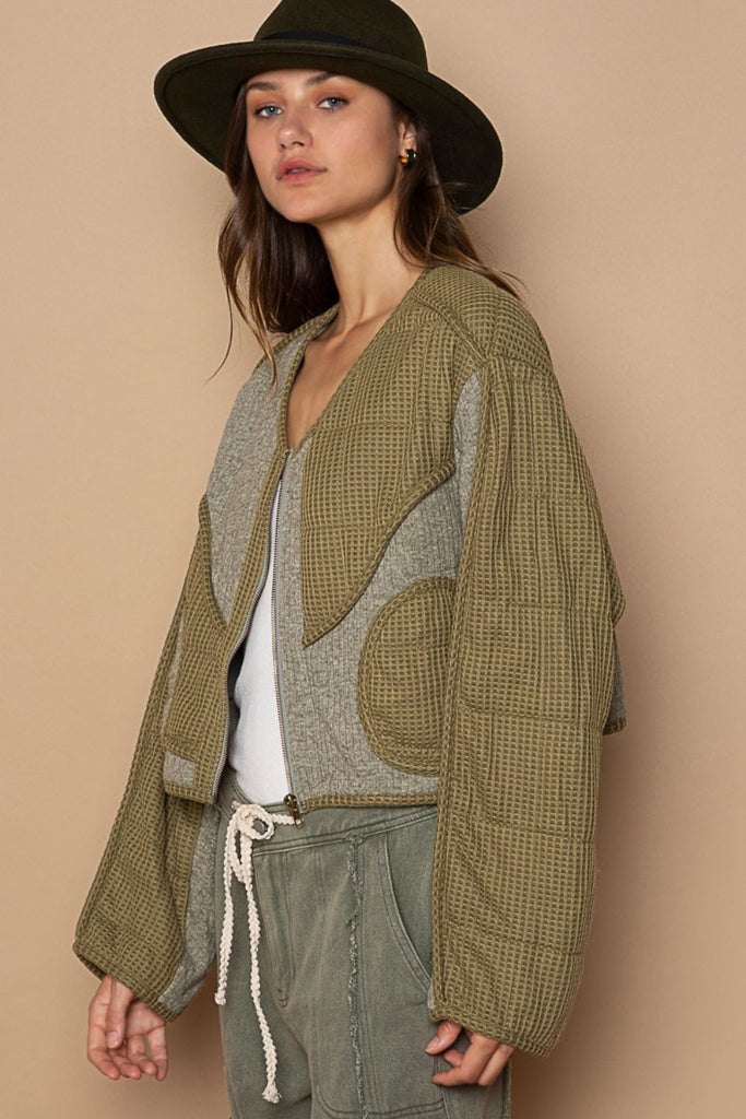 This top is crafted in a V-neckline with long sleeves and a regular fit. The zip-up design adds functionality and style to the garment. Made from quilted knit fabric, this top provides warmth and a cozy texture. The viding detailing adds a unique touch to the design, while the front pockets offer convenience and a casual vibe. The patched knit fabric further enhances the visual interest of the top, creating a modern and dynamic look.