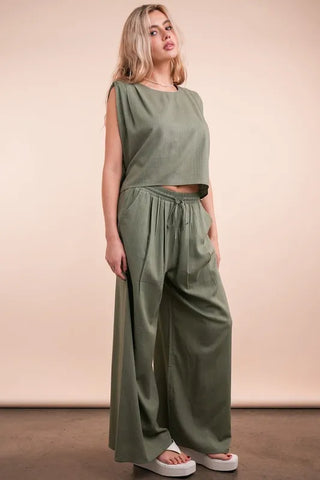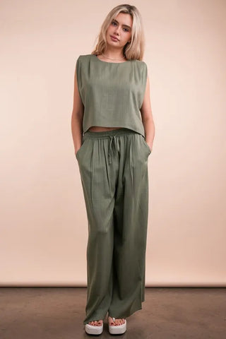 The solid woven top and pants set is a versatile and chic outfit option that offers a coordinated and put-together look. The solid color adds a touch of sophistication, making it easy to dress up or down for various occasions. This set is perfect for those looking for a stylish and effortless outfit that can take them from day to night with ease.