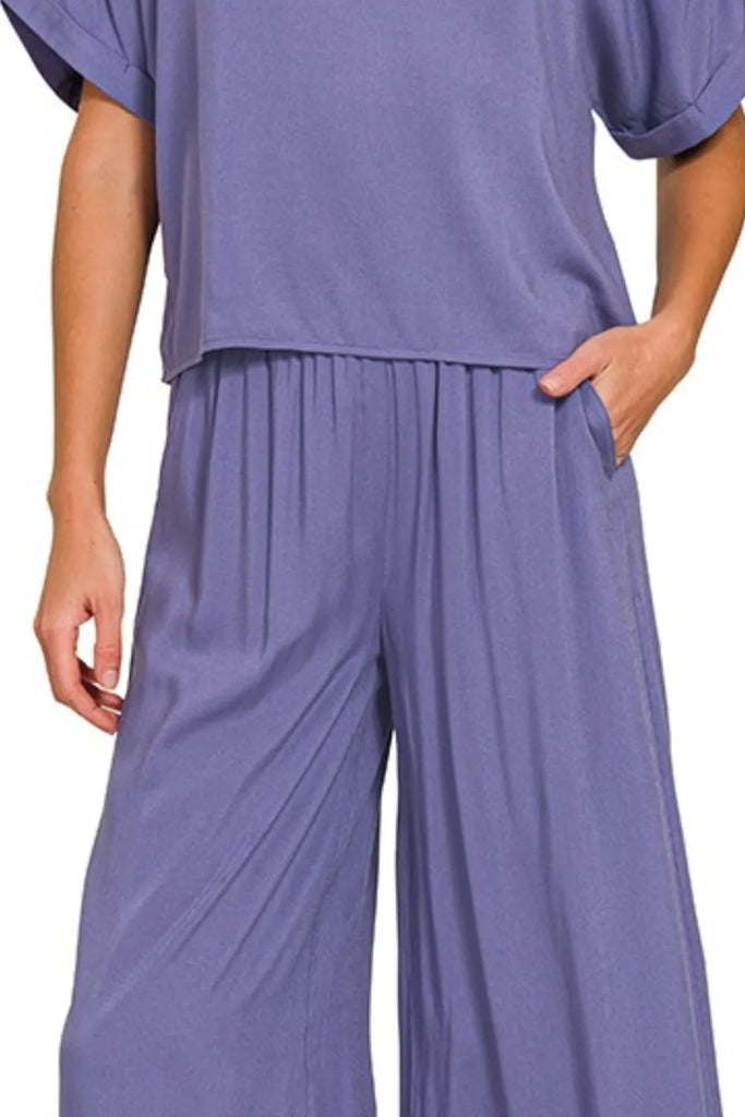 This stylish purple loungewear set features a relaxed-fit top with rolled short sleeves paired with flowing wide-leg palazzo pants. Made from soft, breathable fabric blend that ensures all-day comfort. The elastic waistband provides a comfortable and flexible fit while the coordinated purple colorway creates a cohesive, put-together look. Perfect for lounging at home, casual outings, or as comfortable sleepwear. The flowy silhouette flatters all body types while maintaining a chic, effortless style. Machine washable for easy care and maintenance.